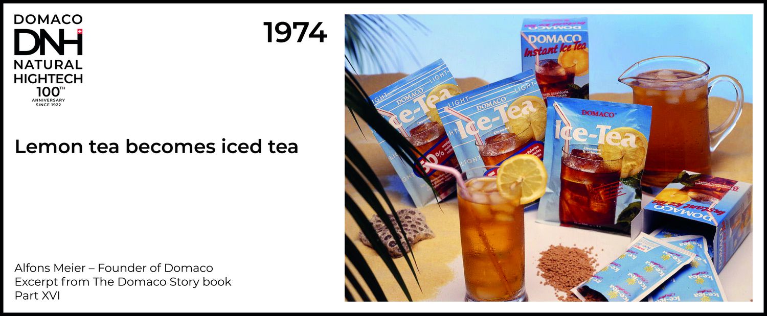 Soon after the success of the herbal healing tea, I started thinking about a new product, because just one seasonal article for the winter was not enough for me. We needed a thirst-quenching product for the summer. As a result, I developed a lemon tea and was able to get a major Swiss distributor interested in it as early as 1974… However, it was difficult to brew the tea by the spoonful in a glass. That set me on the path of making a sachet. I was not able to inspire the major distributor though. However, as I was supplying lemon tea in jars to a catering wholesaler at the same time, I was able to convince them in 1978 to buy the 100 gram sachet in 1978. They wanted to put this sachet in restaurants… We were already satisfied with the sales in the first year, which of course increased the demand from the restaurateurs. Other coffee roasters now also wanted this tea in 100 gram sachets, which we called “Eistee” (iced tea).