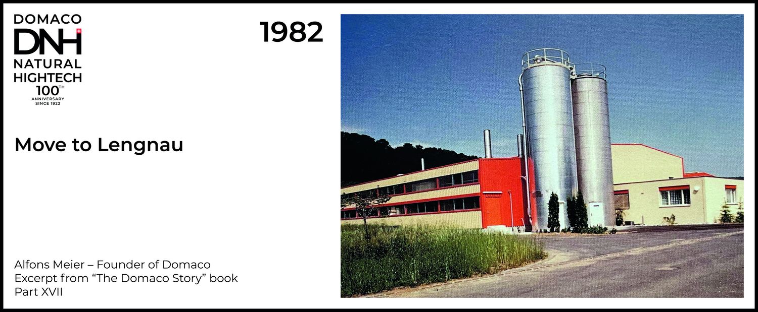 I made another attempt with the Spreitenbach authorities. There would have been land for us there, but only in building rights and for 600 Swiss francs per square metre. Everyone had already built there, and that’s why the responsible municipal authorities only wanted to give the land away in building rights. Then I remembered the land in the Surbtal municipality. After taking a second look at it, I came to a more positive assessment. Strictly speaking, this Lengnau was not that remote: it is barely a 30-minute drive to the airport and about 15 minutes away from the motorway to Zurich and Bern. In addition, Lengnau is still in the access zone for 40-tonne lorries and in the border zone for German employees. Looked at from this perspective, the location had good transport links… As a result, we built Domaco’s first building with a total of 4,000 m2 in Lengnau from 1980 to 1982.