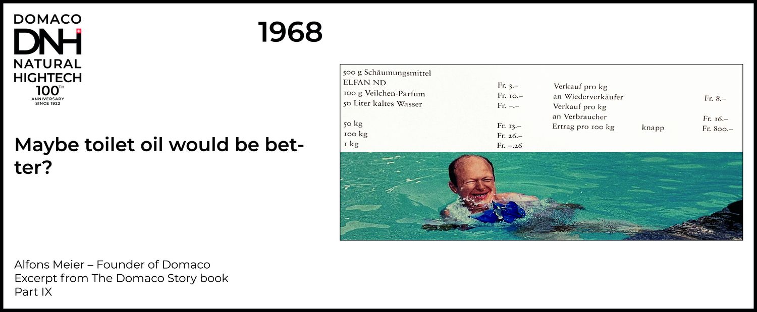 I had invented a very good toilet oil. I tried this product on some well-known restaurant owners, and lo and behold, it was pretty successful. The guests quickly noticed it and told the restaurateur that it smelled much better in his toilet than in the restaurant. Several guests asked about the product. And so it transpired that some of them applied to me to resell the product. I then gave the product to several resellers and agents in German-speaking Switzerland and exclusivity to another one for Ticino. You cannot imagine what a thriving business it turned into. Most Saturdays, my brother and I bottled five to ten 50-litre canisters. The recipe was: 500 g foaming agent, 100 g violet perfume, 50 litres cold water.