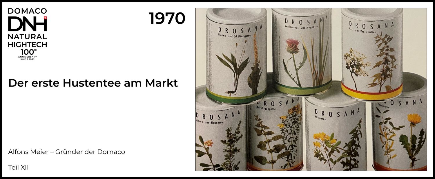 Im Oktober 1970 starteten wir mit einem Produktionsauftrag von 20’000 Dosen Hustentee. Die Amidro nannte dieses Produkt „Drosana Hustentee. Bis Ende 1970 waren bereits die ersten 2000 Dosen verkauft. Im Januar und Februar trafen massenhaft Bestellungen ein. Im Frühjahr 1971 hatten wir bereits die ersten 100’000 Dosen ausgeliefert.