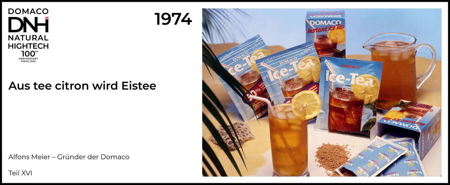 Schon bald nach dem Erfolg des Kräuter-Heiltees habe ich mir Gedanken über ein neues Produkt gemacht, denn nur ein Saisonartikel für den Winter war mir dann doch etwas zu wenig. Es sollte ein durststillendes Produkt für den Sommer werden. In der Folge habe ich dann einen Zitronentee entwickelt und konnte schon 1974 einen Schweizer Grossverteiler dafür begeistern... Es war allerdings schwierig den Tee löffelweise in einem Glas anzumachen. Das brachte mich auf den Weg, eine Beutelpackung zu machen. Den Grossverteiler konnte ich davon allerdings nicht begeistern. Da ich aber zur gleichen Zeit den Zitronentee in Gläsern an einen Gastrogrosshändler lieferte, konnte ich diese 1978 für den Beutel à 100 Gramm überzeugen. Sie wollten diesen Beutel in die Restaurants bringend.... Schon im ersten Jahr waren wir mit den Verkäufen zufrieden, was natürlich die Nachfrage bei den Wirten steigerte. Weitere Kaffeeröster wollten nun auch diesen Tee im 100-Gramm-Beutel, welchen wir Eistee nannten.