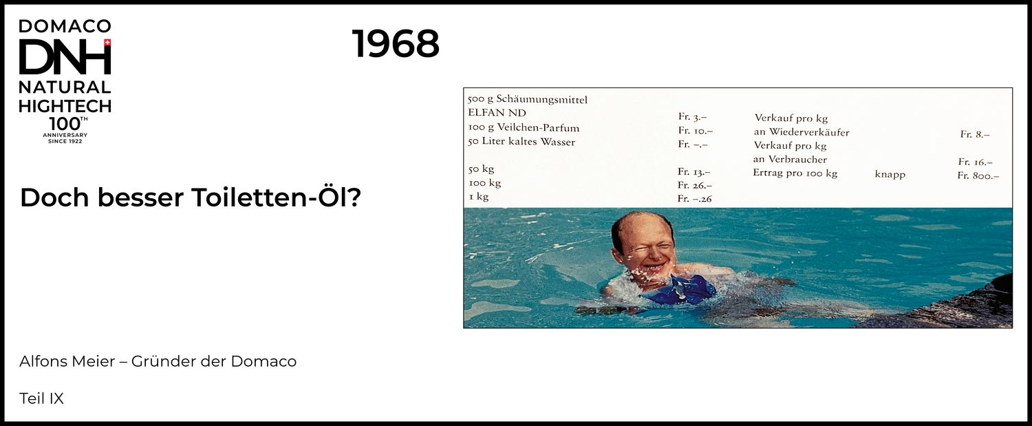 Ein cleverer Handelsvertreter, mit dem ich ab und zu zusammenarbeitete, um einige Produkte von mir zu testen, machte mich auf die Pissoirs, Toiletten in Restaurants und Cafés aufmerksam, in welchen es immer fürchterlich stinke. Er meinte, dass ich in der Lage wäre, ein Mittel zu entwickeln, welches diesen Missstand zumindest erträglich machen würde. Sogleich machte ich mir Gedanken, was ich in dieser Richtung unternehmen könnte. Ich kannte einen Chemiker, Herr Wegman, erzählte mir, dass ein Unternehmen ein reinigendes und überaus schäumendes Konzentrat herstelle. Ich besorgte mir davon einen Liter und machte damit Versuche. Die Reinigung war gut, doch es roch nach nichts. Also machte ich meine Beziehungen geltend und suchte ein sehr konzertiertes Parfum mit Veilchen, Meieriesli- oder Frühlingsblumenduft. Nach mehreren Mischversuchen gelang es mir, eine reinigende und stark erfrischen riechende Lösung herzustellen.